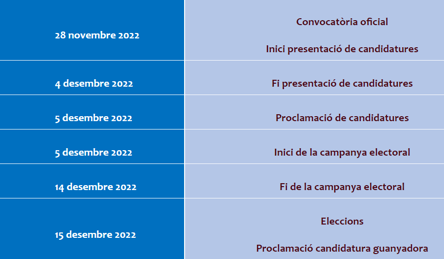 Atès que el proper desembre finalitza el seu mandat l’actual Junta, i tal i com es va comentar a l’Assemblea General de la nostra societat del passat 14 d’octubre, cal convocar eleccions als càrrecs de la Junta i el següent calendari: