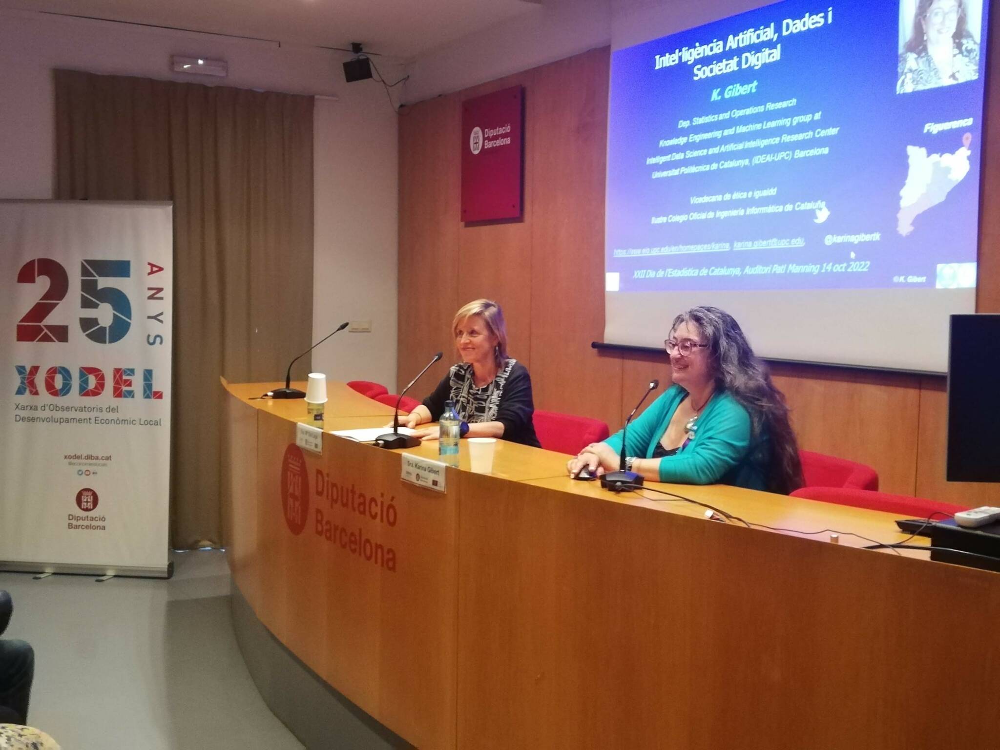 La jornada va continuar amb la presentació, per part de Ma. Sol Lage Torres, cap de l’Oficina Tècnica d’Estratègies per al Desenvolupament Econòmic de la Diputació de Barcelona, de Karina Gibert Oliveras, enginyera i doctora en informàtica i catedràtica a la Universitat Politècnica de Catalunya-Barcelona Tech (UPC). Karina Gibert també és directora del centre de recerca Intelligent Data Science and Artificial Intelligence (IDEAI-UPC). La ponència de la Karina va tractar sobre intel·ligència artificial i la seves potencialitats i usos en una societat cada vegada més digital.